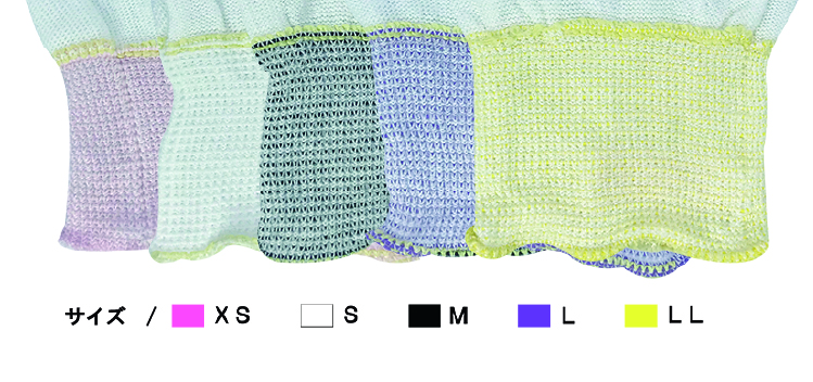 ピンク-XS、ホワイト-S、ブラック-M、パープル-L、イエロー-LL