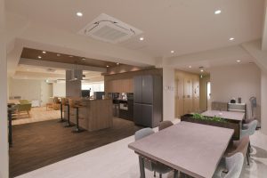 福利厚生設備としてシステムキッチンや大型冷蔵庫、100インチの大型スクリーンを設置し、住空間のくつろぎとオフィスの機能性を融合させた新しいワークプレイスとなっています。